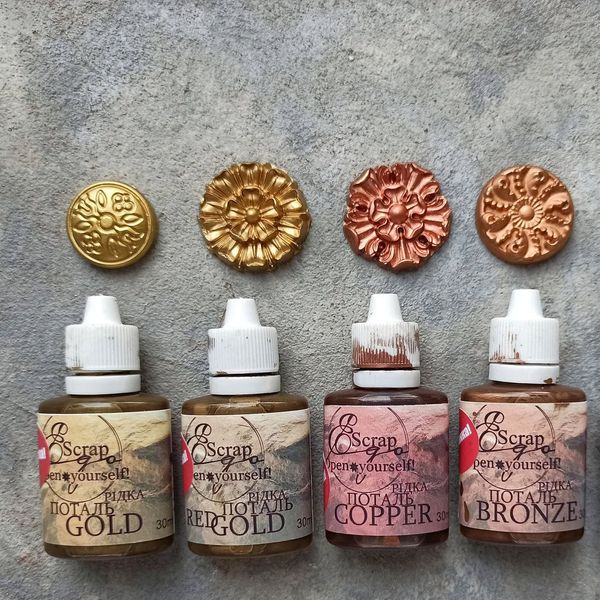 Жидкая поталь "Gold" от ТМ "ScrapEgo" - металлизированная быстросохнущая краска на спиртовой основе, обладающая ярким металлическим блеском. Используется для для воспроизведения цвета драгоценного металла и создания эффекта позолоты на дереве, ткани, картоне, камне, пластике, керамике и других материалах. При обильном нанесении создает плотное металлическое покрытие. На пористых (впитывающих) поверхностях таких как дерево, гипс, картон и т.п. - металлический эффект будет более приглушенным, матовым; на гладких (глянцевых, невпитывающих) поверхностях - металлический эффект будет более ярким. Может использоваться для лессировок (полупрозрачных мазков). Перед использованием, краску необходимо тщательно взболтать (внутри есть специальный шарик, помогающий пигменту подняться). Окрашиваемый предмет должен быть сухим, очищенным от грязи и пыли.